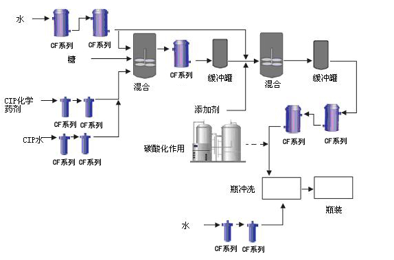 軟飲料生產過程中涉及很多過濾步驟。首先,來源水必須要經過清除其中各種污染物,水的來源將決定清除污物的類型。例如:地表水(湖水、江水)中有水藻和其它